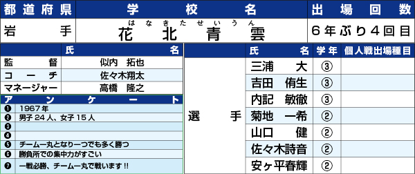 <凡例>①創部年②部員数③前回IH、選抜の成績④IH、選抜の過去の成績⑤今大会の目標⑥チームの特徴⑦キャプテンからの意気込みや抱負 (出場種目S=シングルス、D=ダブルス) X(旧Twitter)でポスト facebookでシェア 投稿日:2014/07/25 ■関連キーワードインターハイ 花北青雲 岩手 IH 山形IH