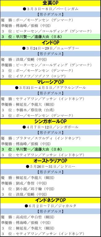 韓国や中国以外では、世界ランク2位のボー/モーゲンセン(デンマーク)、同4位のセティアワン/アッサン(インドネシア)、そして日本の早川賢一/遠藤大由、台湾の李勝木/蔡佳欣らが安定して世界ランク上位をキープしている。