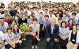 大勢の社員の拍手によって出迎えられた髙橋には、リオ五輪優勝や今年3月の全英選手権優勝など、数々の国際大会優勝を祝した花束が贈呈された。また、林田草樹代表取締役社長から「髙橋選手が当社のラケットを使用して活躍されていることは、社員一同本当にうれしいし、ものづくりの自信になっています。今月20日から開催のヨネックスオープンジャパン2016でも、ぜひ頑張っていただきたい」とエースを送られた。髙橋も「いまのDUORA7に変えてすぐの全英選手権などで結果が出せました。まずは目の前のヨネックスオープンジャパンに集中したいです。引き続き応援をよろしくお願いします」と、凱旋試合となる大会に向けての思いを語った。