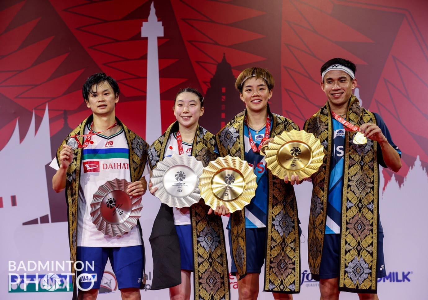 混合ダブルスは、渡辺勇大(上写真・左端)/東野有紗が、タイのデチャポル/サプシリーに0—2で敗戦。惜しくも優勝を逃した。第1ゲームは16-11とリードをした日本ペアだったが、じわじわと点差を縮めるタイペアに逆転を許して19-21。後がない第2ゲームも、前半に8連続失点を喫した渡辺/東野が、そのままタイペアに突き放されて11-21で苦杯。ツアーファイナルズ初優勝には届かなかったが、準優勝の好結果でインドネシア遠征を終えている。