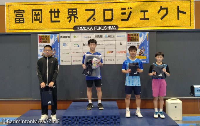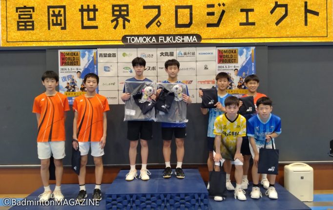 『富岡世界プロジェクト』が5月3日から6日まで、福島県・富岡町総合体育館と、ふたば未来学園体育館で開催された。同県から世界に羽ばたき東京五輪に出場した桃田賢斗、渡辺勇大、東野有紗に続く選手を発掘・育成し、国内外のジュニア選手たちが交流することにより、世界へ向けての視野を広げて競技力の向上に努めることなどを目的に、初めて行なわれた同大会。海外選手44名を含む総勢165名の選手が参集して、男女U17とU15の単複で熱戦をくり広げ、男子U15の西村采人(ふたば未来学園)が2冠を獲得した。ここでは各種目の上位結果を、表彰写真とともに紹介する。