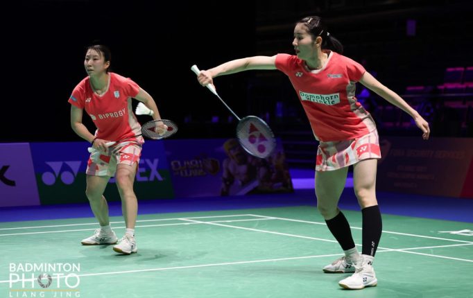女子ダブルスは中西貴映(上写真・左)/岩永鈴と五十嵐有紗/志田千陽の日本ペア対決。香港、韓国でも対戦している2ペアは、中西/岩永が2連勝しており、第1ゲームはその中西/岩永が21−14で先制、しかし第2ゲームは、五十嵐/志田が12本で奪い返し、勝負はファイナルゲームへ突入する。