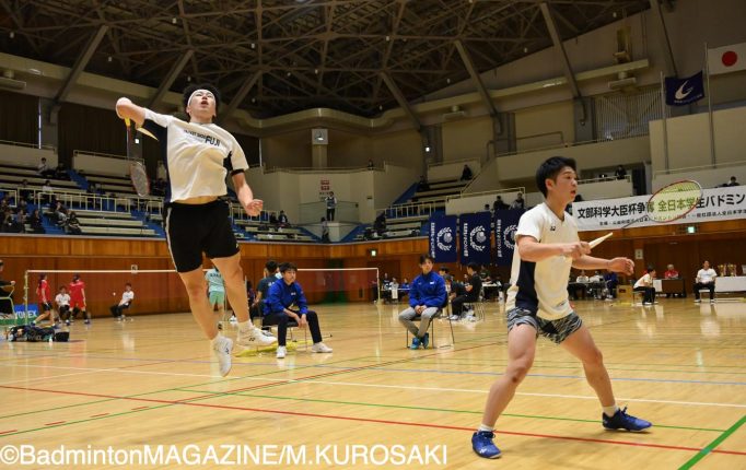 もう一方の山からは、前回大会ベスト4の野口翔平(上写真・左)/安保武輝(筑波大)が勝ち上がり、準決勝で日本大の阿保龍斗/小原輝と激突。前回優勝の佐藤椎名/吉田翼(日本体育大)を4回戦で下した阿保/小原に対し、第1ゲームを13本で制した野口/安保。しかし、第2ゲームを日大ペアが取り返すと、ファイナルゲームは激戦に。先に18−14と筑波大の野口/安保がリードするも、阿保/小原が激しい強打でプレッシャーをかけて19オール。さらに、筑波大ペアがスマッシュをネットにかけ、日大ペアがマッチポイントを奪った。