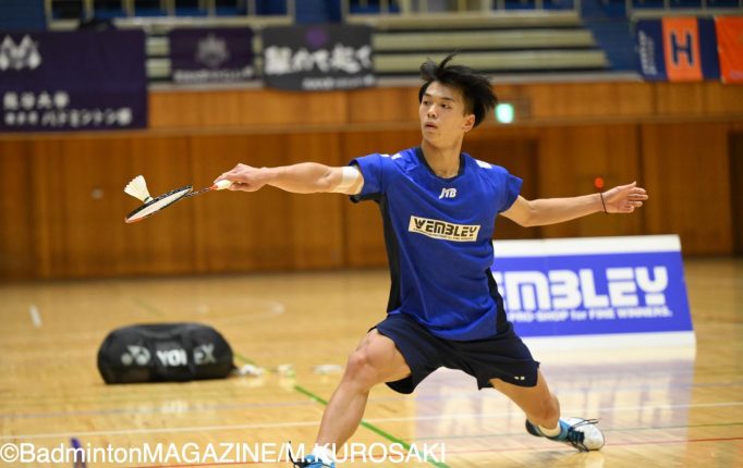 決勝の舞台に立ったのは、3年ぶり2回目の優勝をねらう宮下怜(明治大/上写真)と、1年生ルーキーの山田琉碧(日本体育大)。ともにスマッシュが持ち味という攻撃型の2人の対決は、第1ゲームを宮下が21−16で先制。山田にいい体勢でアタックをさせず、レシーブから落ち着いて自分のペースをつくり、得点を重ねていった。