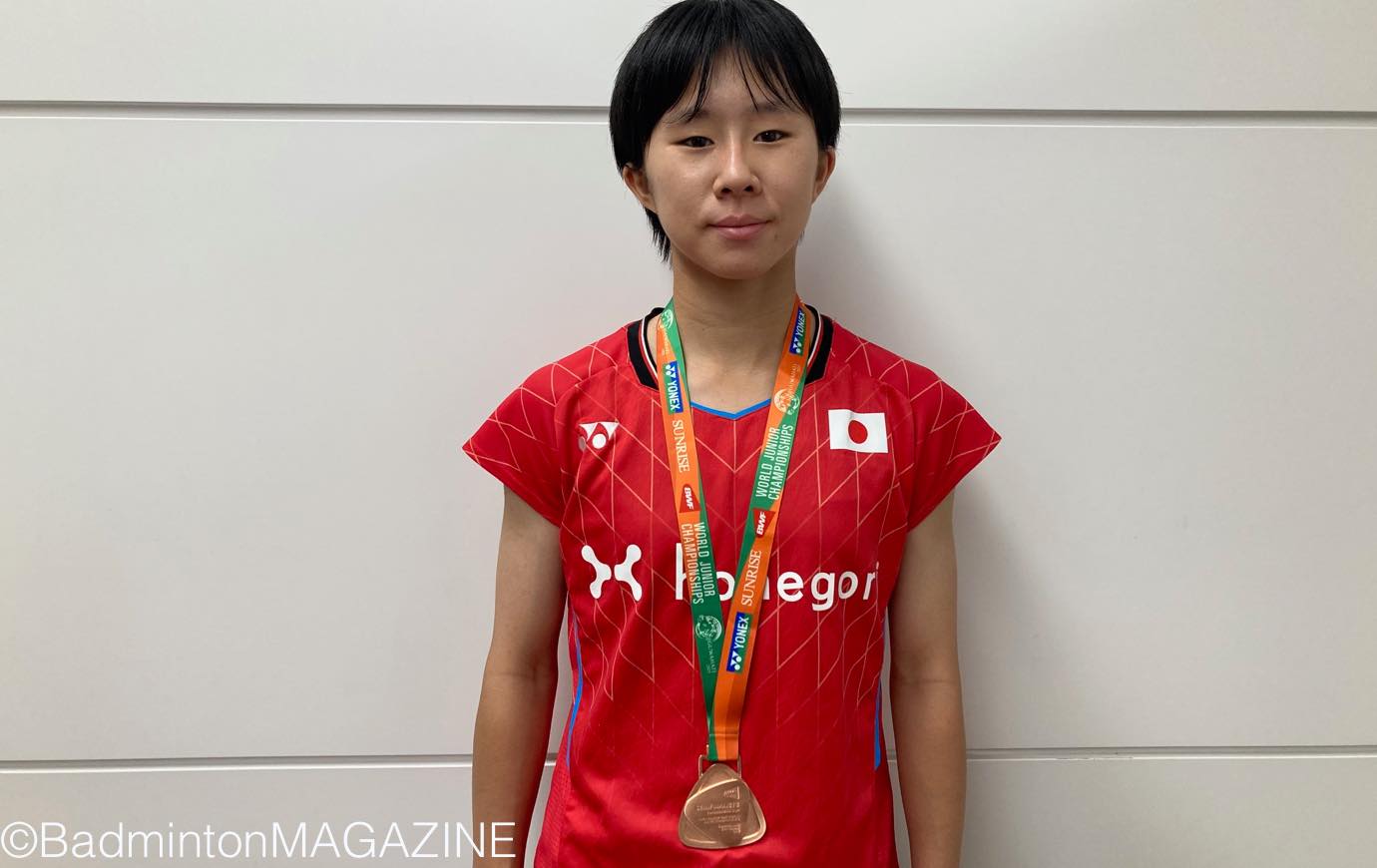 10月6日から19日までインドのグワーハーティーで開催されたBWF世界ジュニア2025に出場した日本代表が10月21日に帰国。日本代表は団体戦で銅メダル、個人戦では男子ダブルスの川野寿真/澤田修志が銅メダルを獲得した。個人戦での8強入りは、女子シングルスの渡邉柚乃、松本紗季、混合ダブルスの澤田/伴野碧唯。ここでは、団体戦でも中国選手からリードを奪うなど活躍した渡邉柚乃のコメントを紹介する。