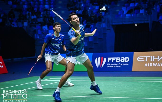 そのほかの種目では、男子シングルスに出場している地元フランスのクリスト・ポポフ(上写真・左)が、クンラビット・ビティサラン(タイ)を破って決勝に進出。地元Vに王手をかけた。男子ダブルスでは、インドネシアの新ペアのアルフィアン/フィクリが決勝へ。今季絶好調の徐承宰(ソ・スンジェ)/金ウォンホ(韓国)と対決する。