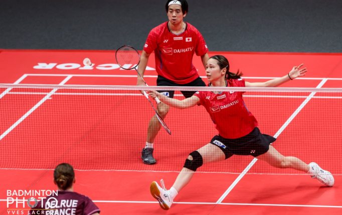混合ダブルスの緑川大輝/齋藤夏(上写真・手前)も、勝てば準決勝の切符が手に入る状況の中、フランスのジケル/デリュウィ(フランス)と激突した。第1ゲームを制した緑川/齋藤は、第2ゲーム21オールから相手に連続ポイント許して21−23。1−1のイーブンに持ち込まれたが、最終ゲームは12−10から3連続ポイントなどで抜け出し、21−14でフランスペアを撃破。予選リーグを2勝1敗とし、2位で準決勝進出を決めた。
