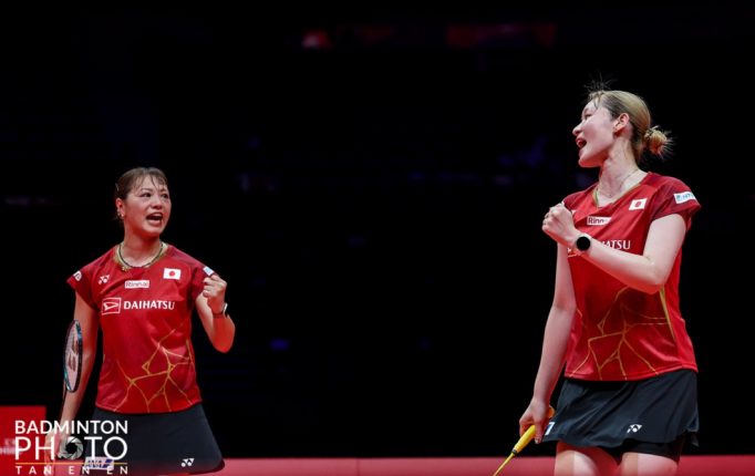 第1ゲームは、中盤まで競り合う展開となったが、福島/松本が先に19−15と差を広げる。ここからマレーシアペアが4連続得点で19オールとしたが、終盤に意地を見せた日本ペアが21−19で制し、プレッシャーをかける。第2ゲームは、ティナー/タンに1−7とリードを許した福島/松本だったが、中盤に11オールまで追いつくと、その後も連続ポイントを奪取。流れを手にした福島/松本が最後は21−13で難敵を下し、決勝進出を決めた。