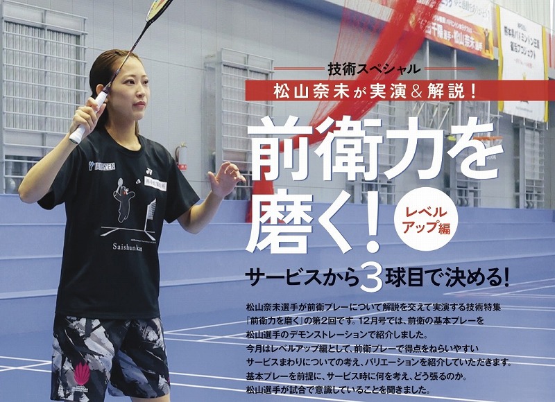 志田千陽選手とのペアでパリ五輪銅メダル、世界選手権銅メダルなど世界で輝かしい活躍を見せてきた松山奈未選手。女子ダブルス屈指の前衛力を誇る選手として知られています。バドミントン・マガジン1月号の技術特集では、12月号に続いて『前衛力を磨く』をテーマに、松山選手に前衛プレーを解説していただきます。今月号はレベルアップ編として、前衛プレーで得点をねらいやすいサービスまわりでの考え、バリエーションを紹介していただきます。