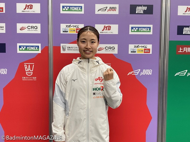 明日は、自分ができることをコートの中で出すということは変わりませんけど、この試合を楽しみに総合に来ました。考えすぎずにやりたいけど、考えなさすぎたらやられてしまう。出だしから向かっていけるようにしたいです。自分が気負うところは何もないと思っているので、奥原さんにどれだけ向かっていけるか、自分の意地も持ちながら、コートでぶつかれたらと思います。