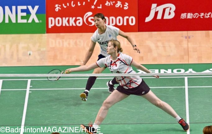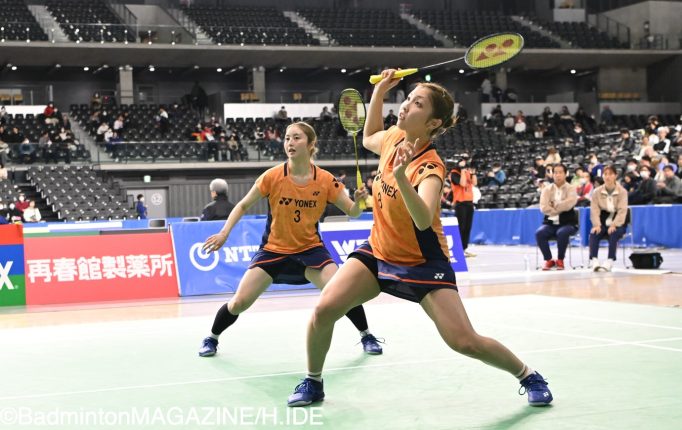 廣田彩花(上写真・左)/櫻本絢子(岐阜Bluvic/ヨネックス)は、インカレ優勝の中出すみれ/田邉裕美(龍谷大)の挑戦を退けた。前に出ながら、後ろに下がりながら攻撃し続ける中出/田邉が、第1ゲームを22-20で先取。しかし、世界を舞台に戦ってきた廣田/櫻本は慌てることなく、21-12、21-17と逆転勝利。全日本社会人優勝ペアが、70分に及ぶ戦いを制した。準決勝の相手は福島/松本だったが、すでにケガによる棄権が発表されており、廣田/櫻本は決勝進出が決まった。