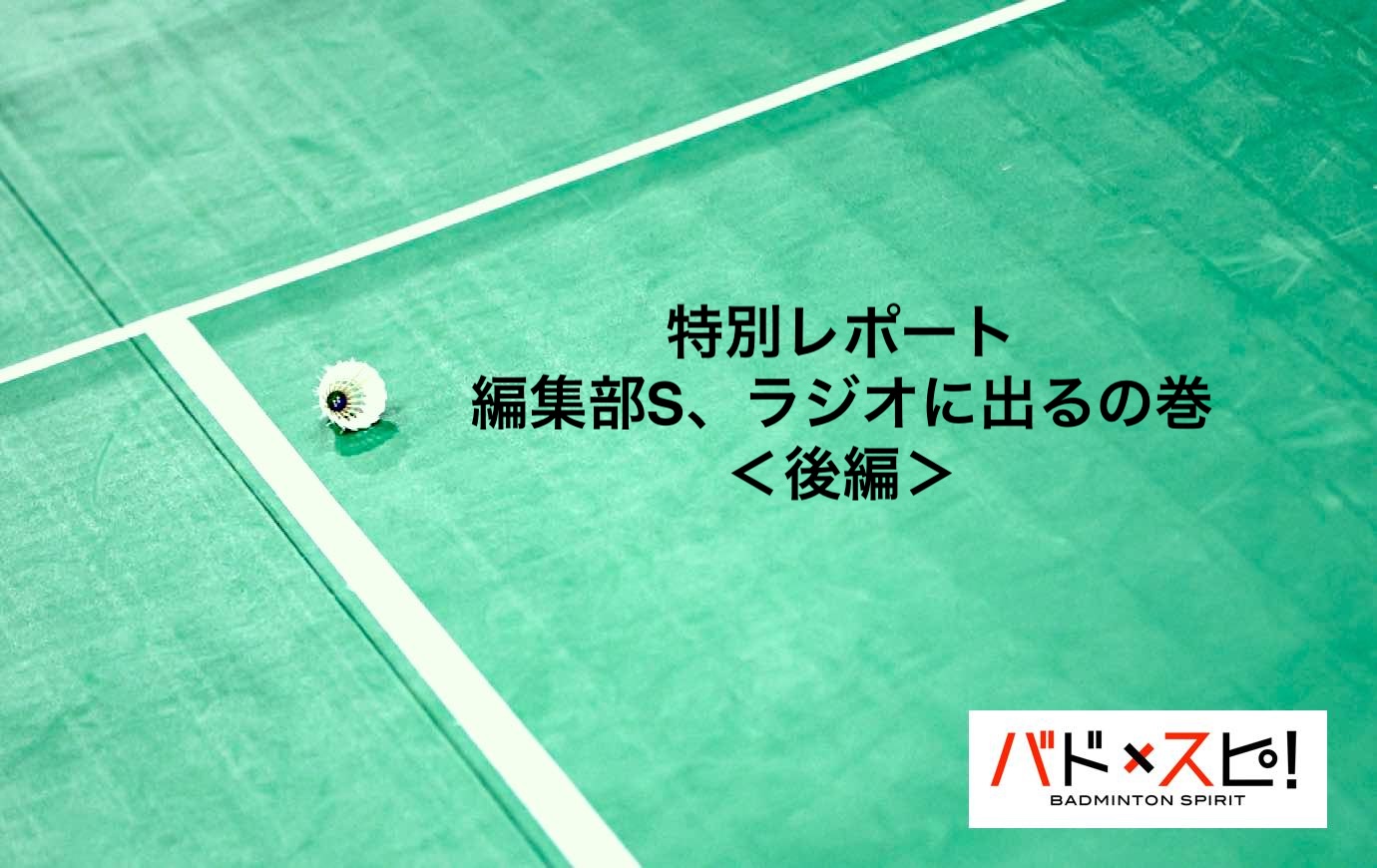 番組収録に参加しての感想です。〝楽しかったぜ!〟と振り返られるほどの余裕はありませんでしたが、収録された音声をラジオで聞いた時はとてもうれしかったです(普通の感想ですみません)。何より、バドミントンだけの話題で、1時間の放送が流れたことに感動。また、試合解説などをしている髙橋さんが、淀みなくトークを展開していることや、高野さんの声の聞きやすさ、間の取り方のうまさにずっと感心していました。やっぱり、その道のプロの方は素晴らしいですね。