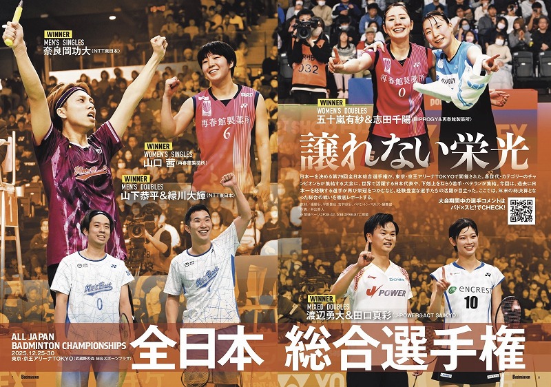 バドミントン・マガジン2月号の巻頭は、2025年末に行なわれた全日本総合選手権のレポートです。バドミントンの日本一を決める全日本総合には、世界で活躍する日本代表から、各世代・カテゴリーのチャンピオンなどが集結。経験豊富なベテランに、下克上をねらう若手が挑む、また注目のダブルスペアの対戦など見どころも多かった印象です。本誌では、各種目のレポートから、注目選手のクローズアップなど様々な角度からレポートしています。