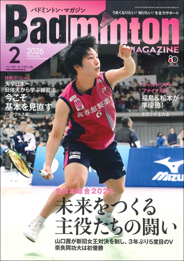 1月22日にバドミントン・マガジン2月号が発売されました! 今月号の特集や特別企画の内容などを数回に分けて紹介します。なお、バドマガの購入は、お近くの書店、またはAmazonや楽天ブックス、スポーツクリックなどをご利用ください。