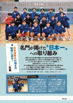 今月号では、大学日本一に輝いた日本体育大・男子チームを取材。久々の優勝に手にした感想や、チームの取り組みなどについて大束忠司監督にお聞きしました。また、前編となる今回は、団体優勝に貢献した選手の中で、シングルス陣が登場。シングルス勢が普段の練習で取り組んでいる内容や、そのポイントを紹介しています!