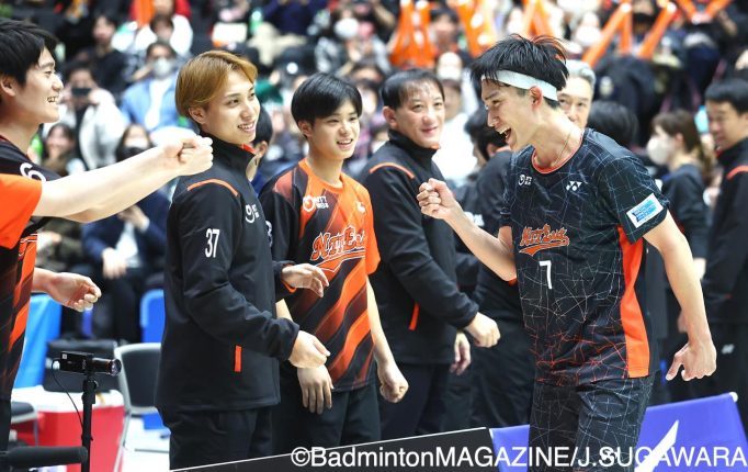 渡邉も第1ゲーム終盤には連続得点で食らいついたが、桃田が18本でこのゲームを奪取。すると、第2ゲームは完璧にゲームを支配した桃田が、渡邉をわずか6本に抑えてNTT東日本に流れを引き寄せた。
