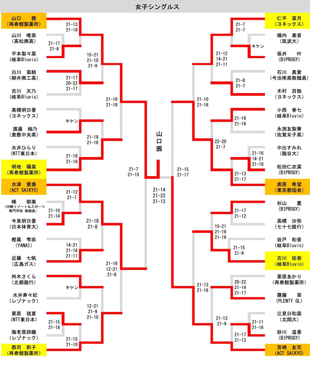 山口茜(再春館製薬所)②〔15-21、21-10、21-9〕1●白川菜結(柳井商工高)