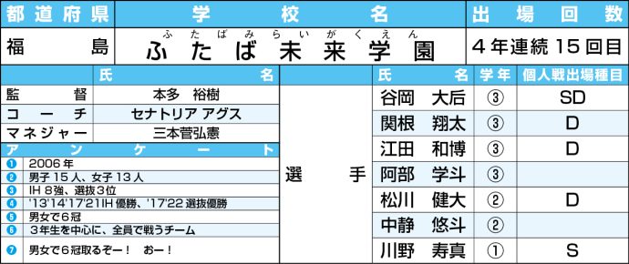 <凡例>①創部年②部員数③昨年度のIH、選抜の成績④IH、選抜の過去最高成績⑤今大会の目標⑥チームの特徴⑦キャプテンからの意気込み (出場種目S=シングルス、D=ダブルス) 構成/バドミントン・マガジン編集部 X(旧Twitter)でポスト facebookでシェア 投稿日:2022/08/12 ■関連キーワードIH 高校生 高校 インターハイ 北海道