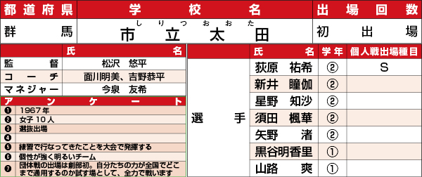 <凡例>①創部年②部員数③前回IH、選抜の成績④IH、選抜の過去の成績⑤今大会の目標⑥チームの特徴⑦キャプテンからの意気込みや抱負 (出場種目S=シングルス、D=ダブルス) X(旧Twitter)でポスト facebookでシェア 投稿日:2014/07/29 ■関連キーワード選手名鑑 群馬 IH 団体戦 熊本インターハイ 熊本IH 市立太田 インターハイ 熊本