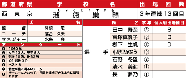<凡例>①創部年②部員数③前回選抜、IHの成績④選抜、IHの過去の最高成績⑤今大会の目標⑥チームの特徴⑦キャプテンの意気込みや抱負(出場種目S=シングルス、D=ダブルス) 構成/バドミントン・マガジン編集部 X(旧Twitter)でポスト facebookでシェア 投稿日:2020/02/24 ■関連キーワード選手名鑑 鹿児島 高校 鹿児島選抜 高校選抜 選抜