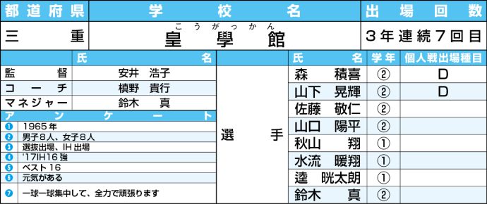 <凡例>①創部年②部員数③前回選抜、IHの成績④選抜、IHの過去の最高成績⑤今大会の目標⑥チームの特徴⑦キャプテンの意気込みや抱負(出場種目S=シングルス、D=ダブルス)