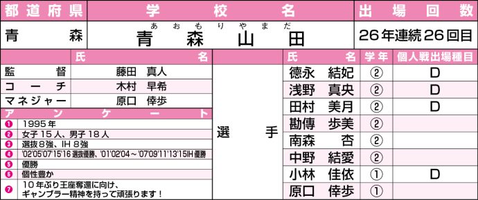 <凡例>①創部年②部員数③前回選抜、IHの成績④選抜、IHの過去の最高成績⑤今大会の目標⑥チームの特徴⑦キャプテンの意気込みや抱負(出場種目S=シングルス、D=ダブルス)