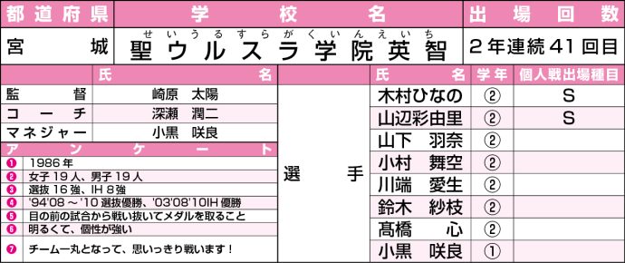<凡例>①創部年②部員数③前回選抜、IHの成績④選抜、IHの過去の最高成績⑤今大会の目標⑥チームの特徴⑦キャプテンの意気込みや抱負(出場種目S=シングルス、D=ダブルス)