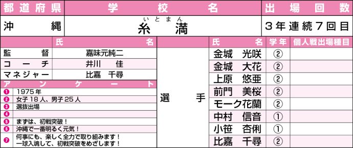 <凡例>①創部年②部員数③前回選抜、IHの成績④選抜、IHの過去の最高成績⑤今大会の目標⑥チームの特徴⑦キャプテンの意気込みや抱負(出場種目S=シングルス、D=ダブルス)
